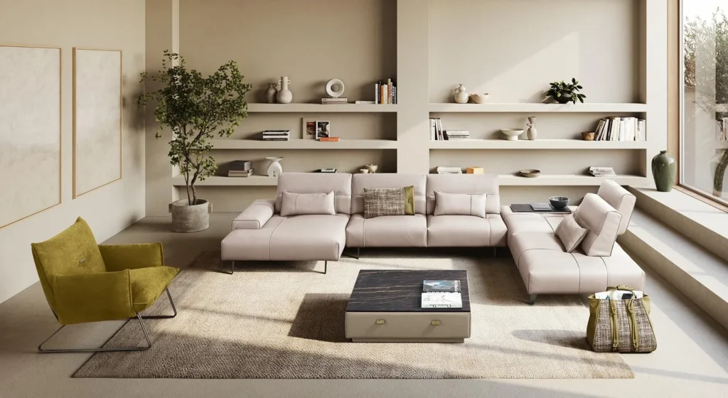 Flexform is synonymous with “discreet luxury,” focusing on timeless designs that do not shout for attention but command it through sheer quality. Their leather sofas are world-renowned for their deep, generous proportions and the use of premium cowhides that are exceptionally breathable. Flexform’s signature aesthetic involves slim metal or wood bases paired with oversized, feather-filled leather cushions, creating a visual lightness. This brand is perfect for open-concept living rooms where you want a large sectional that feels airy rather than cumbersome.