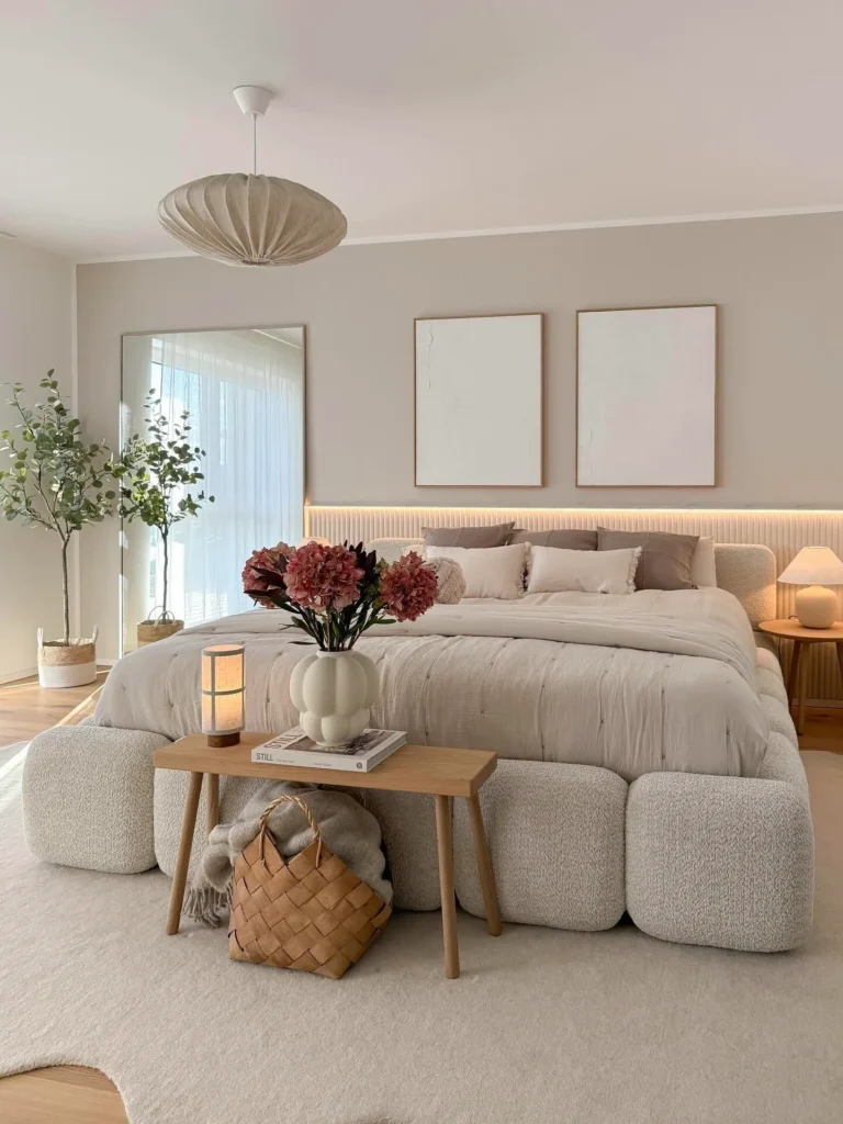Soft furnishings feature low-saturation fabrics, natural wood furniture, and textured lighting fixtures,