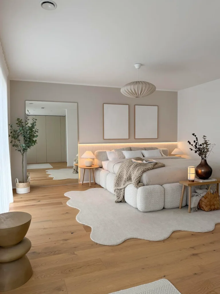 This home embraces a modern wabi-sabi aesthetic, featuring an overall palette of off-white and light wood tones.