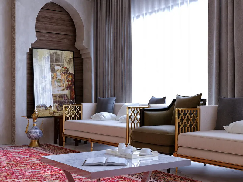 This Qatari villa’s custom decor blends Arabic-Moorish style: arched details, gilded lattice, warm neutrals with red rug, luxe brass/chic soft furnishings.